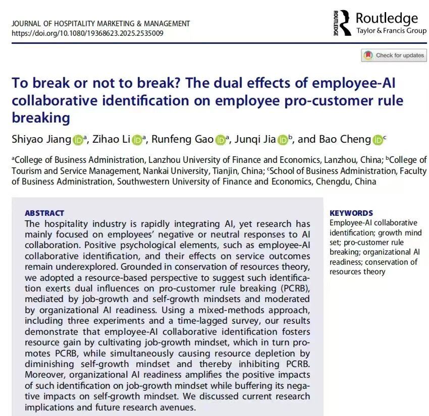 姜诗尧博士研究成果《To break or not to break? The dual effects of employee-AI collaborative identification on employee pro-customer rule breaking》发表于期刊《Journal of Hospitality Marketing & Management》。该期刊为全球管理学领域的权威核心期刊,隶属中科院一区TOP期刊。该研究立足AI技术快速发展的时代背景,突破性地将研究视角从“员工对AI协作的负面反应”转向“积极心理机制”,创新性提出“员工-AI协作认同”这一核心构念。采用混合研究设计,揭示了员工-AI协作认同经由员工差异化发展心智对亲顾客规则违背的双重影响机制。该研究对于优化行业人力资源管理与提升行业可持续竞争力具有重要参考价值,也为理解人机协作时代的组织行为变革提供了新的理论视角与实践启示。