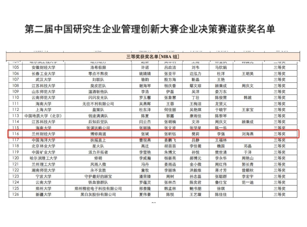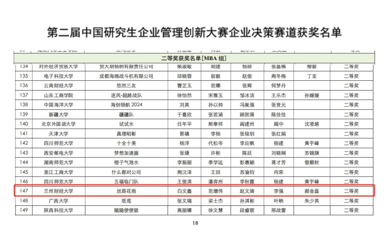 近日,由中国学位与研究生教育学会主办,全国工商管理专业学位研究生教育指导委员会承办的2024 年中国研究生管理创新大赛落下帷幕,本场赛事吸引了来自298所院校的4091支队伍报名参赛。经过初赛和复赛的激烈角逐,我院MBA学员白文鑫、范增伟、赵文旖同学组成的“丝路花雨”队荣获全国二等奖;张斌、张昕钰、樊莉同学组成的“博修商道”队荣获全国三等奖。