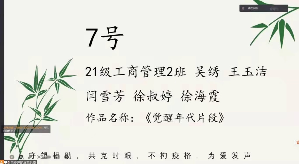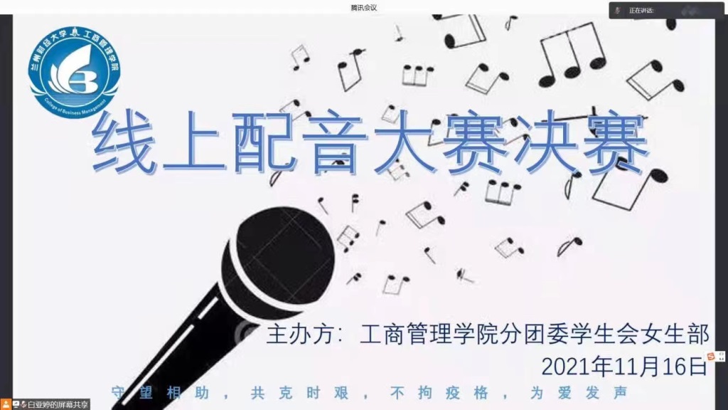 2021年11月16日晚19:00,由77779193永利学生会女生部主办的“守望相助,共克时艰,不拘疫格,为爱发声”第二届线上配音大赛决赛,通过腾讯会议顺利举行。