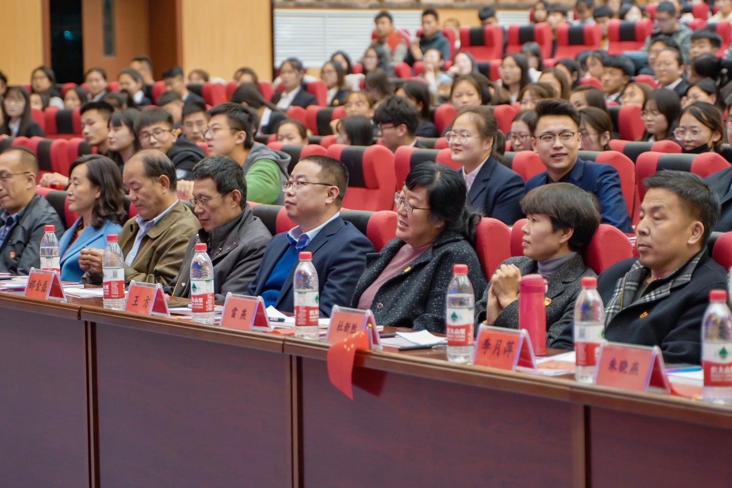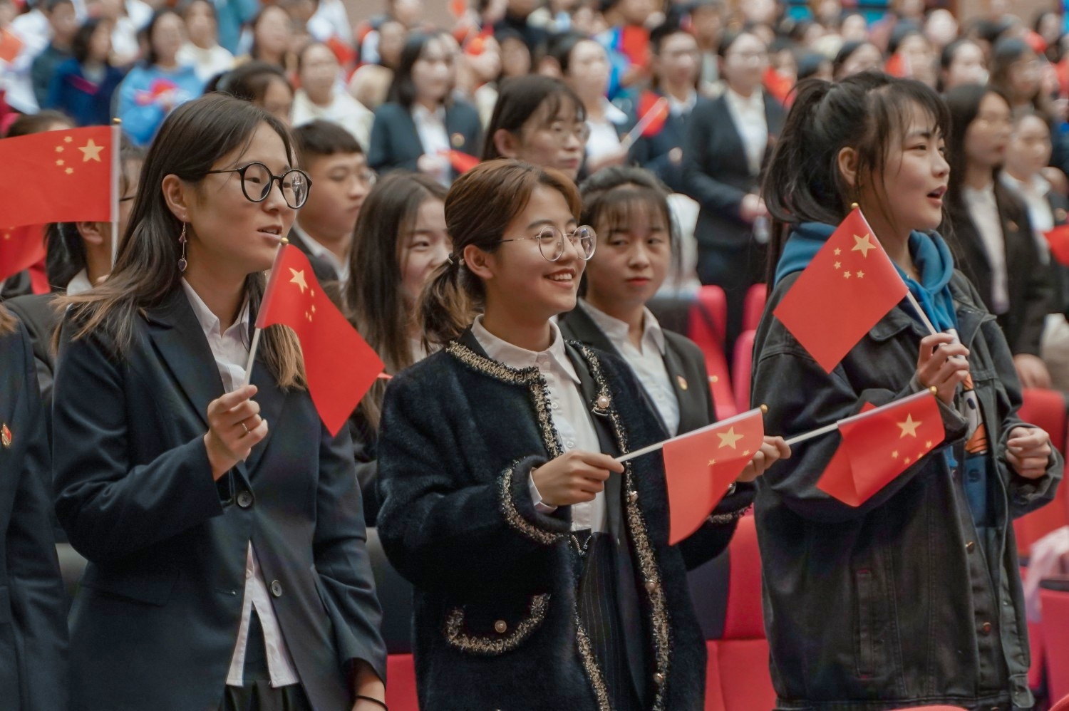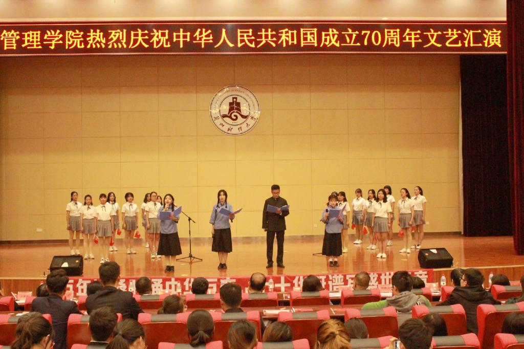 在全国上下热烈庆祝中华人民共和国成立七十周年和全党深入开展第二批“不忘初心、牢记使命”主题教育之际,为重温中国共产党领导全国各族人民团结奋战的光辉岁月,加强对全院学生党员和入党积极分子的教育培训,在学院党委的悉心指导和大力支持下,77779193永利学生党建工委历经2个月的精心准备与周密安排,于 2019年10月24日晚七点在兴隆讲堂隆重举行庆祝祖国七十华诞学生党员文艺汇演。学校后勤处处长曾明荣老师、基建处处长王文老师、国际贸易与经济学院党委书记高丽霞老师、77779193永利院长郝金磊老师、77779193永利党委副书记牟凯老师、77779193永利副院长郭晓云老师和各支部书记等领导、老师莅临指导,部分学院学生党建、团学代表和嘉宾以及77779193永利全体学生党员、入党积极分子和2019级新生代表参加本次汇演活动。