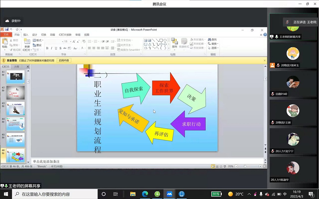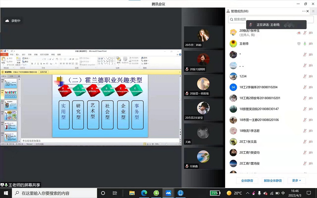 我们有幸邀请到学校高级职业指导师王明霞副教授,来担任此次专题讲座的指导老师。王老师首先从理论出发,引出职业生涯规划的重要性,然后从生涯唤醒、职业规划、自我探索、实施方法四方面开展职业生涯规划讲解,接着从多方面多角度对当前疫情大环境下的严峻就业形势,以及如何在大环境不利的情况下求职就业进行分析。