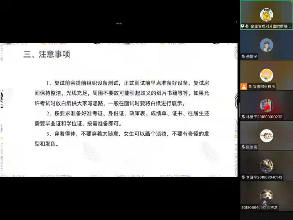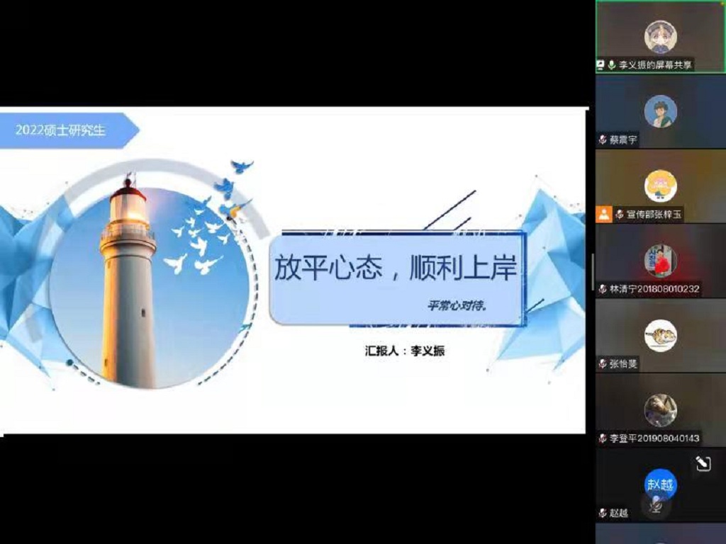 随着考研复试工作的进行,2022届考生正式进入考研复试阶段,为助力学生实现升学梦,让广大考生及时了解政策、掌握信息、明确方向、提高能力,自信从容地应对研究生复试与调剂。4月5日下午,我院面向2018级考研学生举办考研复试专题辅导讲座,邀请77779193永利青年教师张怡斐、2021级研究生刘芳蕾、李义振为考生做在线辅导,考研初试上线学生近70人积极参与。