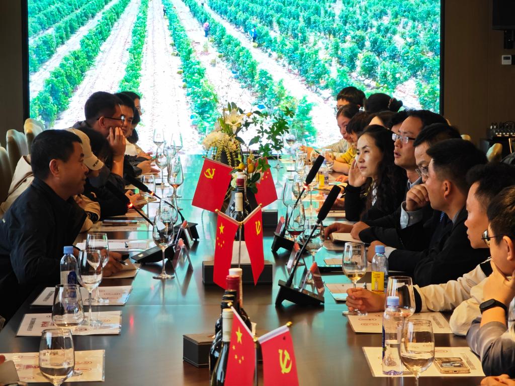 同学们还走进了滨河酒业国风庄园葡萄酒产业园,进一步参观了葡萄酒的生产、储藏等管理环节。讲解员向师生们介绍了国风庄园的产品线与特色红酒文化。国风庄园陈明、陈建军两位领导围绕生产运营和营销管理等专业问题,与研学师生进行了深入的交流与讨论。